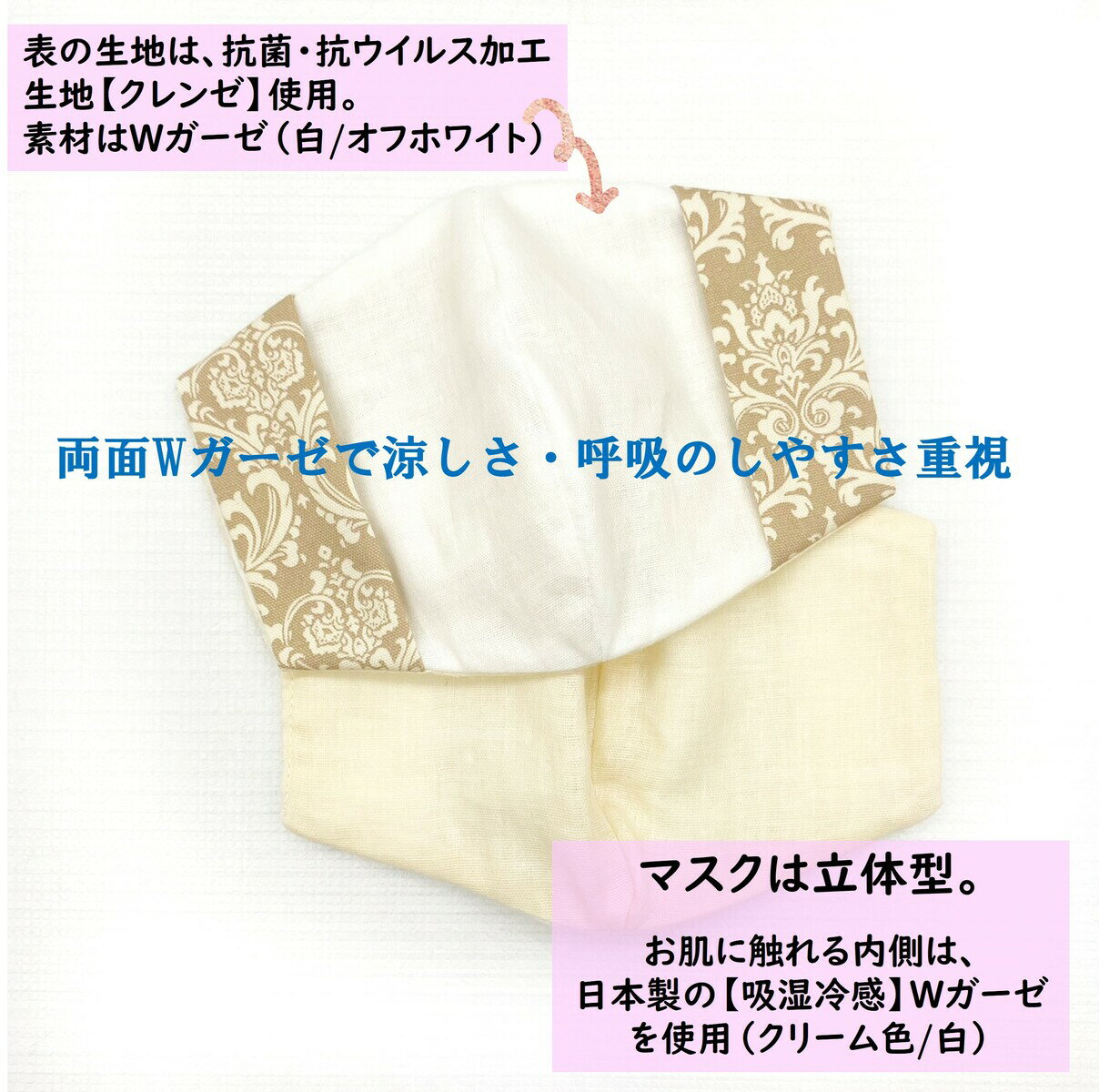 また、表生地の抗菌・抗ウイルス加工生地【クレンゼ】を、張りのあるブロード生地から柔らかくて風通しのいいWガーゼタイプに変更しました。