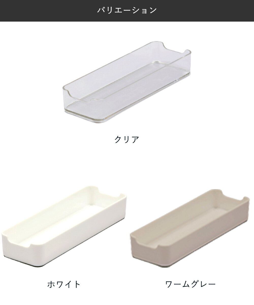 ■商品概要商品名 : どこでも!整理トレー Lカラー : クリア・ホワイト・ワームグレーサイズ : (約)8.8×26.4×4.2cm 日本製材質: ポリスチレン樹脂(耐熱温度70℃ 耐冷温度−20℃)